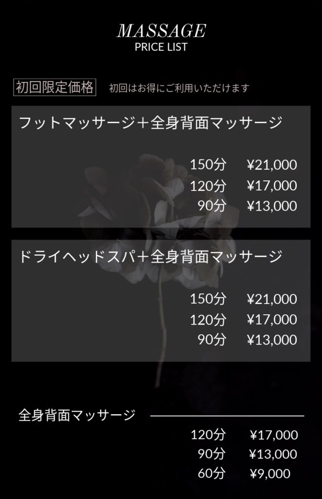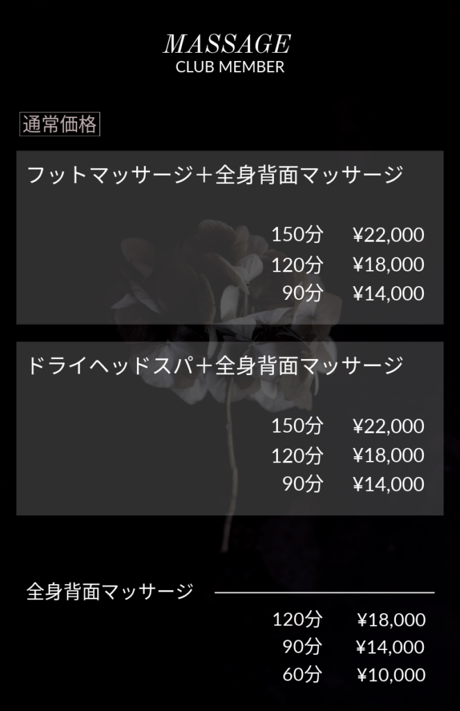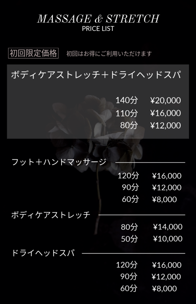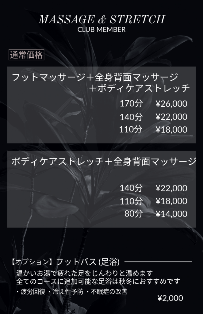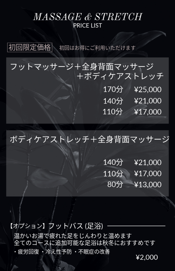 ※全てのコースにお会計、お着替え、カウンセリング時間が含まれます。